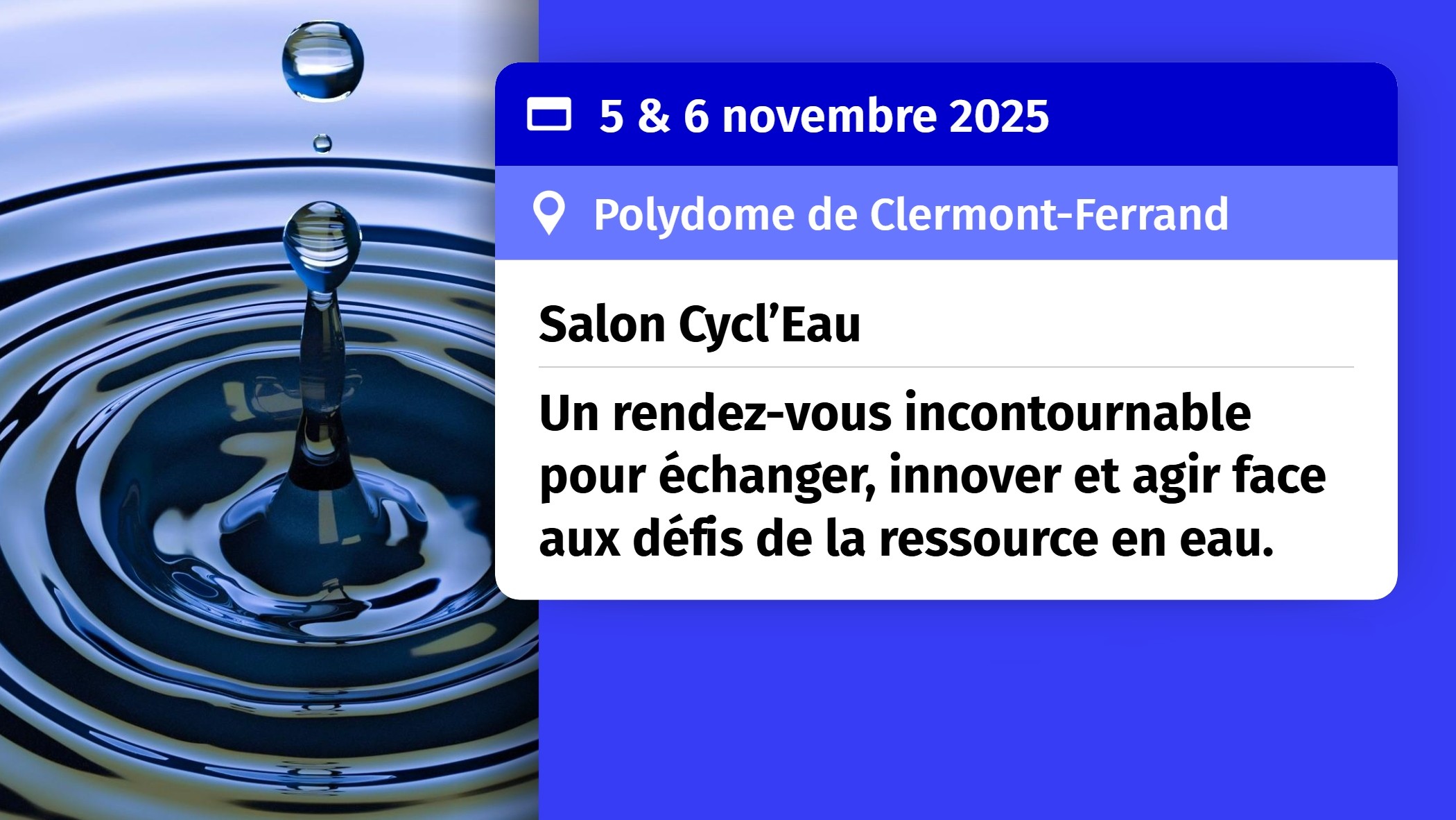 ![]() Salon Cycl’Eau à Clermont-Ferrand Salon Cycl’Eau Clermont-Ferrand : deux jours dédiés aux enjeux de la gestion et de la préservation de la ressource en eau. Rendez-vous les 5 & 6 novembre 2025 au Polydome, pour rencontrer les acteurs clés de la filière, découvrir des innovations et partager ... |